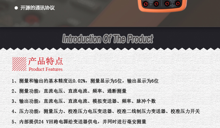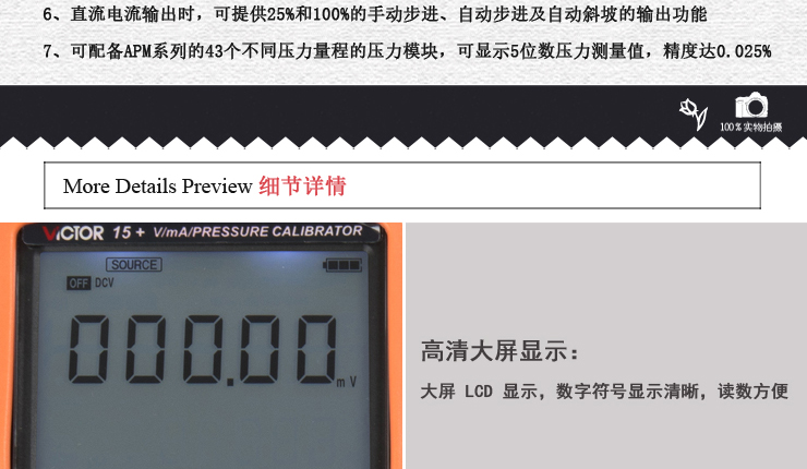 VICTOR 15+ VmA壓力校驗儀是一款0.02%精度的高性能過程校驗儀,具有模擬輸出直流電壓、直流電流、模擬變送器、頻率、脈沖個數(shù)等功能,同時具備測量直流電壓、直流電流、頻率、通斷測試以及壓力測量等功能;該儀表開放通訊協(xié)議,便于二次開發(fā)。