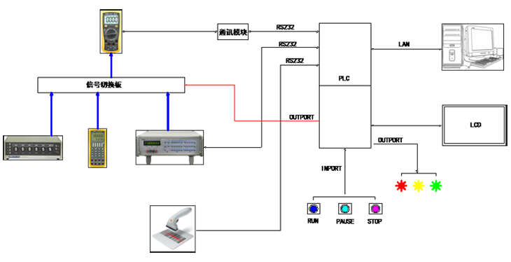 自動化測試系統(tǒng)是用于自動校準、檢驗三位半或四位半數(shù)字萬用表的自動化裝置。系統(tǒng)分為:被檢萬用表、標準設備、PLC控制系統(tǒng)、計算機等部分組成。系統(tǒng)通過在PLC的控制下完成對檢測對象的機械聯(lián)動、電氣連接、通訊控制、信息顯示、數(shù)據(jù)采集和傳輸?shù)裙δ埽挥捎嬎銠C進行數(shù)據(jù)的收集和存儲。從而實現(xiàn)基本全自動化的校準和檢驗工作。 可根據(jù)用戶需求定制,為用戶提供完美的自動測試解決方案。