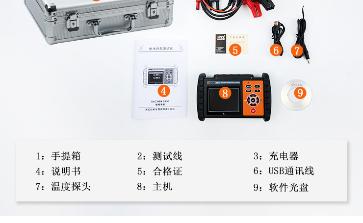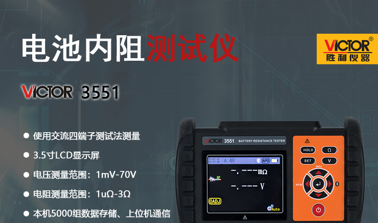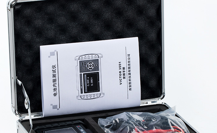 VICTOR 3551 電池內(nèi)阻測試儀是用于測量鉛蓄電池、鋰電池等充電電池的內(nèi)阻、電壓與溫度,以判斷電池健康狀態(tài)的測量儀器,同時可以作為測量電解電容ESR參數(shù)的儀表(僅供參考)。本儀表使用交流4端子測試法測量電池內(nèi)阻,可不受測試線、端子與電池電極之間接觸電阻影響測量正確的測量值。同時還具有數(shù)據(jù)存儲、數(shù)據(jù)查閱、報警、自動關(guān)機等功能。整機高檔美觀,量程寬廣,分辨率高,操作便捷,攜帶方便,準確、可靠、性能穩(wěn)定,抗干擾能力強。是電池生產(chǎn)、電池安裝、設(shè)備生產(chǎn)、設(shè)備維修等場景必不可少的儀器。