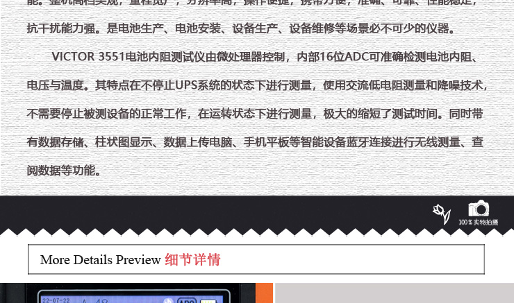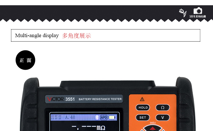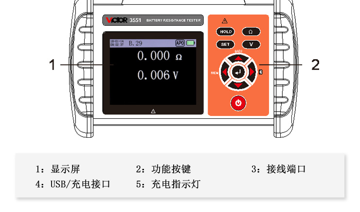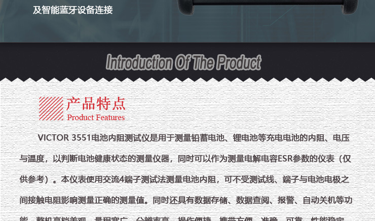 VICTOR 3551 電池內(nèi)阻測試儀由微處理器控制,內(nèi)部16位ADC可準確檢測電池內(nèi)阻、電壓與溫度。其特點在不停止UPS系統(tǒng)的狀態(tài)下進行測量,使用交流低電阻測量和降噪技術(shù),不需要停止被測設(shè)備的正常工作,在運轉(zhuǎn)狀態(tài)下進行測量,極大的縮短了測試時間。同時帶有數(shù)據(jù)存儲、柱狀圖顯示、數(shù)據(jù)上傳電腦、手機平板等智能設(shè)備藍牙連接進行無線測量、查閱數(shù)據(jù)等功能。