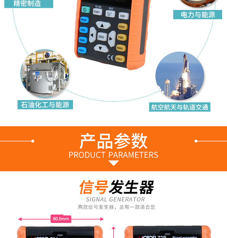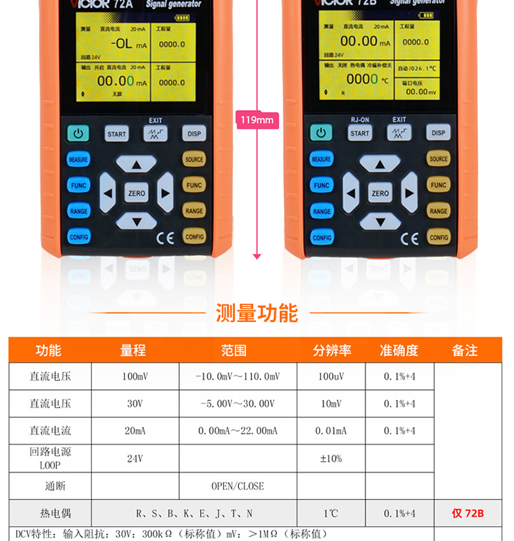 信號發生器,可用于測量直流電壓、直流電流、通斷,可模擬輸出直流電壓、直流電流、熱電偶、頻率。適用于現場變送器、DCS、PLC等系統的調試和校準。VICTOR 72B在石油化工、生物制藥、工業自動化、大專院校和科研機構等領域的得到了廣泛的應用,是工程師、技術工人及科研人員的“口袋級”實用工具。