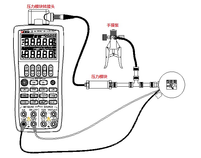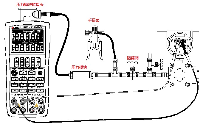 將VICTOR 25的輸入設置為提供回路電壓同時測量電流,輸出設置為壓力,通過改變外部壓力源的輸出壓力,便可對壓力變送器進行校準。